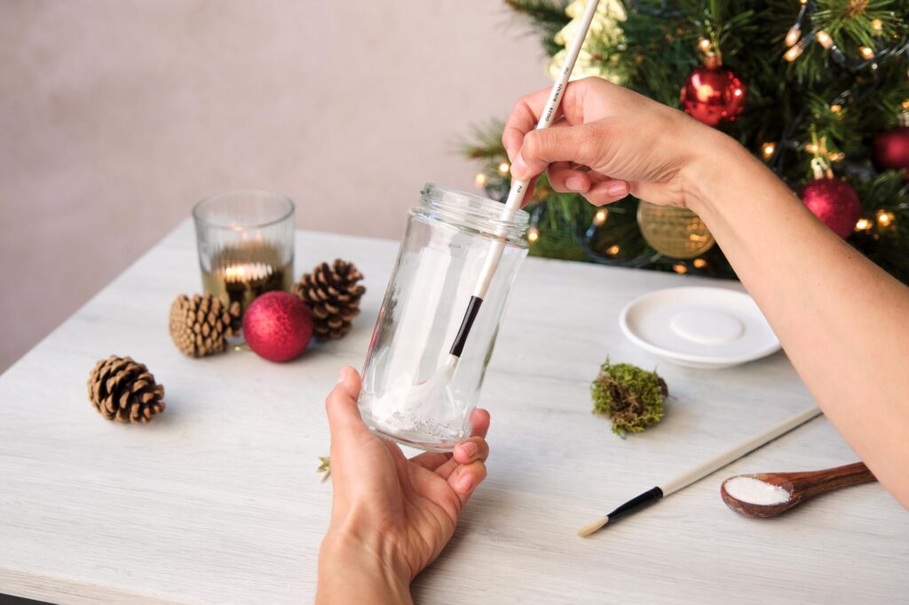 Levitä purkin yläreunan sisäpuolelle ohut kerros liimaa, johon ”lumi” kiinnittyy.