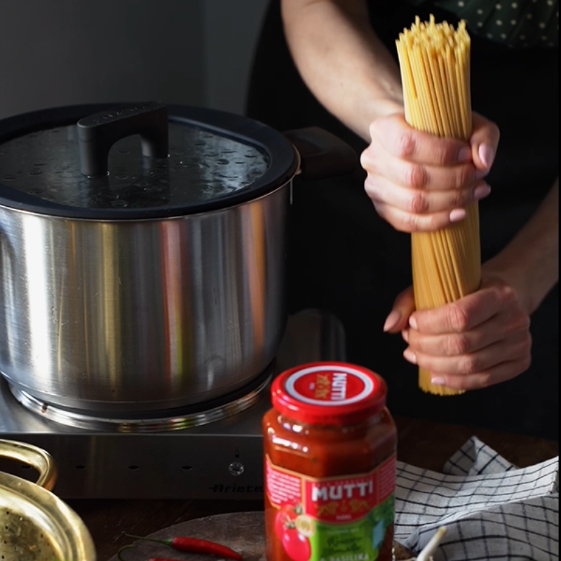 1. Kuumenna valmis tomaattikastike syvässä kattilassa ja laita pasta reikäkauhalla pannulle kypsennyksen kahdeksi viimeiseksi minuutiksi. Näin pasta imee itseensä kastikkeen maun ja siitä tulee erityisen maukasta.