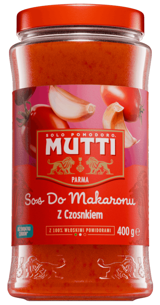 Sos do makaronu z czosnkiem Mutti zawiera wyłącznie najwyższej jakości, w 100% włoskie pomidory zbierane latem w szczytowym okresie dojrzałości. Słodki i intensywny w smaku pomidor Rossoro połączony z czosnkiem „Aglio di Voghiera ChNP*”, pochodzącym z prowincji Ferrara i słynącym ze swojej słodyczy i delikatności, tworzą zbilansowany i aromatyczny sos do makaronu.