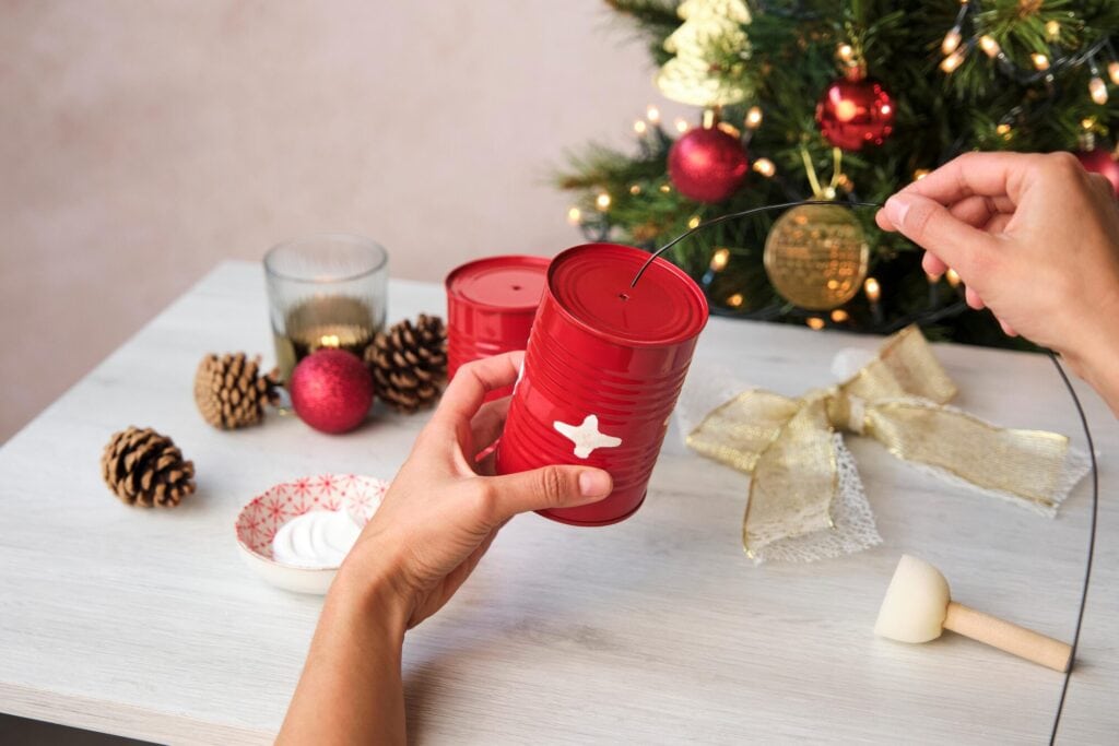 Ia conservele de Mutti Roșii Tăiate Fin și fă cu grijă câte o gaură în centrul bazei fiecăreia. Aceste găuri vor fi folosite pentru a trece sârma care va ține conservele împreună, formând coronița.