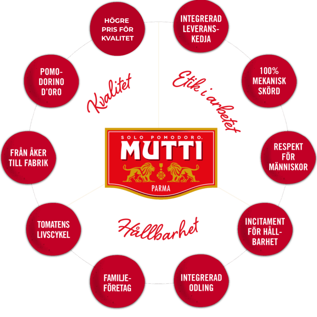 Mutti är ett familjeföretag sedan fyra generationer som alltid enbart har satsat på att producera tomater av hög kvalitet. Vår logotyp, som registrerades 1911 och som vi fortfarande använder, består av två lejon som skyddar Muttis första kvalitetsutmärkelse. Denna utmärkelse symboliserar den inriktning som företaget har än i dag, vilken kommer till uttryck i samband med att vi belönar våra 40 bästa jordbrukare vid den årliga utdelningen av guldtomaten, Pomodorino d’Oro, och i det högre genomsnittspris vi betalar för att få tomater av hög kvalitet.